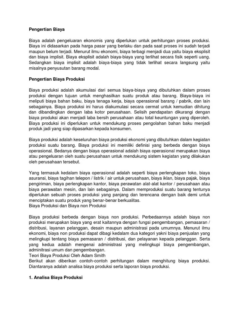 Biaya implisit ini tersirat, tidak mudah dihitung besarannya dan bersifat subyektif. Biaya implisit (implicit cost) adalah suatu jenis biaya yang peluangnya dimanfaatkan dalam sumber daya internal pada perusahaan. Jenis biaya ini tidak akan ditampilkan di dalam laporan keuangan atau pada umumnya dilaporkan sebagai … Biaya implisit adalah biaya yang secara ekonomis harus ikut diperhitungkan sebagai biaya produksi, meskipun tidak dibayar dalam bentuk uang. 10/11/2021 · biaya implisit merupakan salah satu komponen biaya yang tidak mudah diukur dan dinilai secara objektif. Seperti yang sudah sempat dibahas di atas, biaya implisit ini tidak ditampilkan pada laporan keuangan … 15/10/2021 · biaya implisit adalah jenis biaya peluang yang muncul ketika sebuah perusahaan menggunakan sumber daya internal untuk proyek tanpa kompensasi eksplisit untuk pemanfaatan sumber daya. Biaya implisit dapat berupa jumlah uang yang berpotensi hilang karena memilih untuk menggunakan sumber daya internal ini sendiri daripada menerima pembayaran dari pihak ketiga untuk menggunakan sumber daya tersebut. 15/01/2021 · biaya implisit adalah jenis biaya peluang yang manfaatnya dilewatkan oleh perusahaan dengan memilih satu opsi atau alternatif yang lain. Sehingga biasanya biaya ini tidak akan terlihat dalam laporan keuangan perusahaan. 30/04/2021 · implisit cost atau biaya implisit adalah suatu jenis biaya peluang yang dimanfaatkan dalam sumber daya internal suatu perusahaan. Pada dasarnya, implicit cost atau biaya implisit adalah biaya yang tidak terlihat dan bisa meliputi biaya kesempatan ( opportunity cost ), biaya penyusutan alat dan bangunan dalam periode waktu tertentu hingga biaya yang dikeluarkan ketika proses produksi namun bukan dalam bentuk kas. Hal ini juga muncul ketika sebuah perusahaan memilih diantara berbagai alternatif atas penggunaan aset.